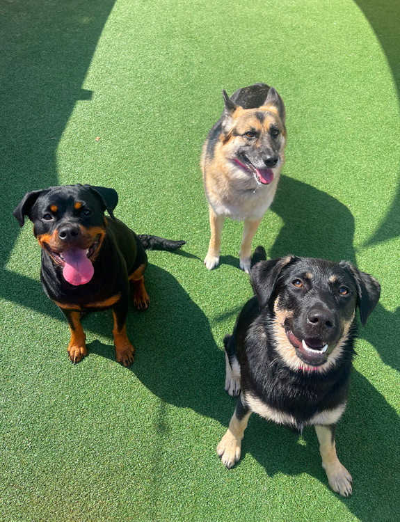 Our outdoor yards are lined with turf that have a drainage system underneath which get sanitized every night.  On those warm summer days, we have dog pools, fans, and misters to keep the pups and staff cool.  Not only do we have outdoor spacious yards, we also have large indoor play areas that keep the fun going no matter the weather.  Whether it’s too hot, too cold, or too rainy, our indoor yards ensure the dogs stay active, social, and safe every day they are here!